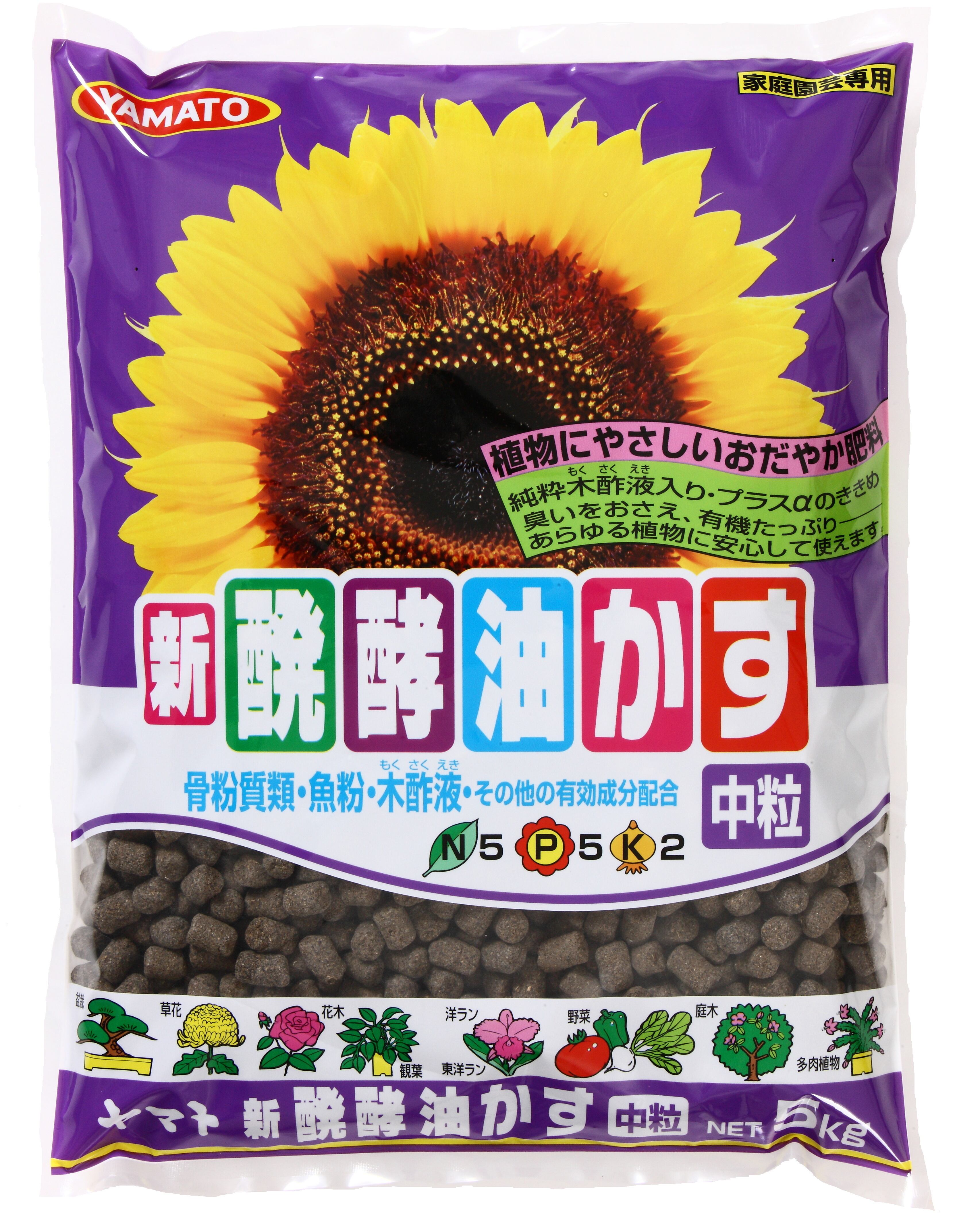 油かすを主体に骨粉質類、魚粉、純粋木酢液、その他の有機質などを特殊醗酵しました。